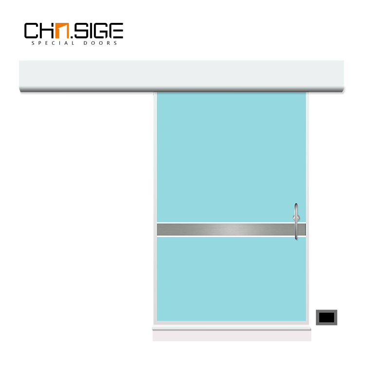 手術室門因無菌操作要求,門體、防撞帶、觀察窗必須在同一平面,防止塵埃堆積。在材質上也選擇易于清潔的潔凈板材,方便保潔人員定期清理。同時為避免醫護人員雙手接觸,采用微電腦控制的腳踏感應方式來開啟手術門。